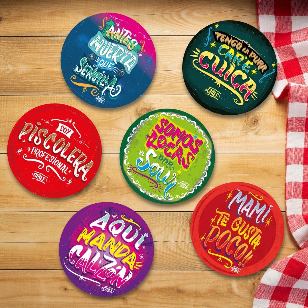 Pack de 6 posavasos de madera + base de corcho con diseños inspirados en la gráfica popular chilena de Populeras. Perfectos pa’ esas juntas peligrosas con tus mejores amigas: risas, cahuín y vasos bien puestos.