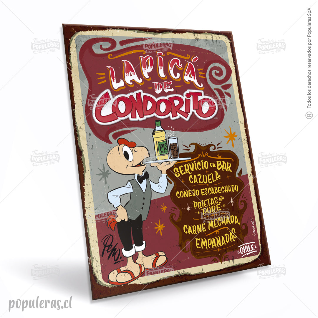 Medida: 25 x 35 cm. Cartel hecho a mano, luego digitalizado e impreso en adhesivo laminado mate. Emplacado en latón galvanizado con bordes reforzados. Especial para tu quincho y cualquier lugar de tu nueva casa. Para hacer un Regalo Chileno a tus parientes y amigos del extranjero para llevarlos a otro país cuando vayas de visita. También desarrollamos carteles personalizados pregunta a carteles@populeras.cl
