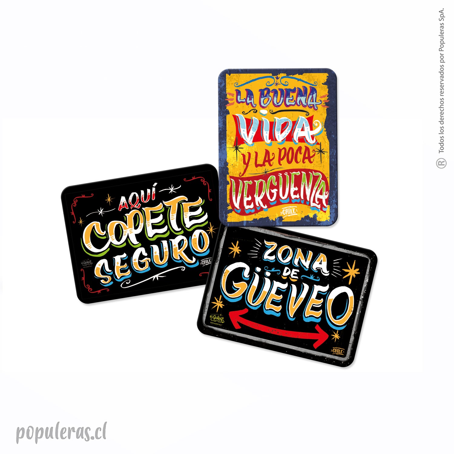 Pack de 3 magnéticos con diseños de carteles. Es una lámina de imán con un adhesivo laminado montado en ella, para pegar en superficies metálicas. tanto en interior como exterior. Medidas: 8 x 14 cm. y de 8 x 11 cm.