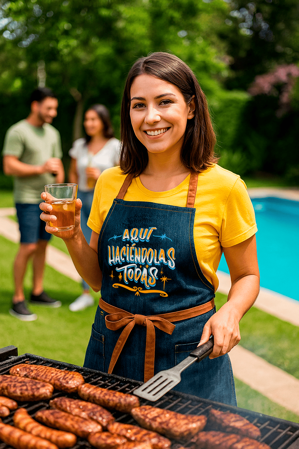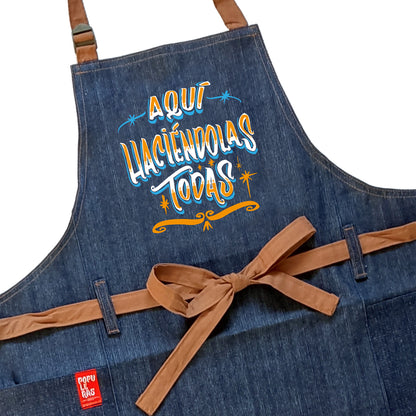 Pecheras hechas en mezclilla azul con diseño para ellas, que se la ponen en la casa. Gráfica representativa de la identidad popular chilena.
