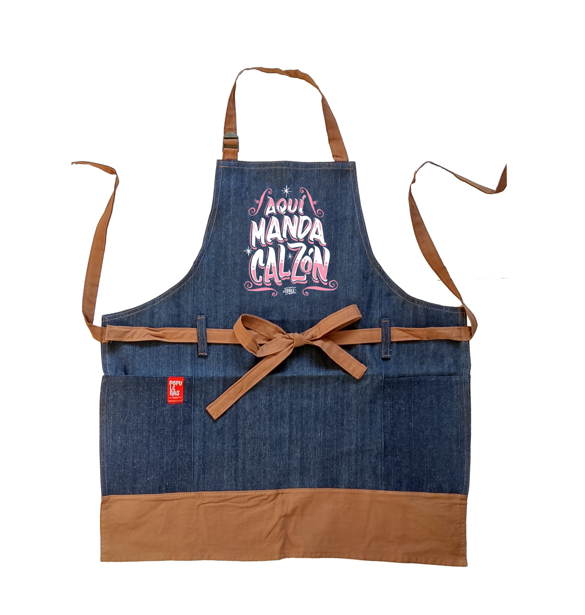 Pecheras hechas en mezclilla azul con diseño para ellas, que se la ponen en la casa. Gráfica representativa de la identidad popular chilena.