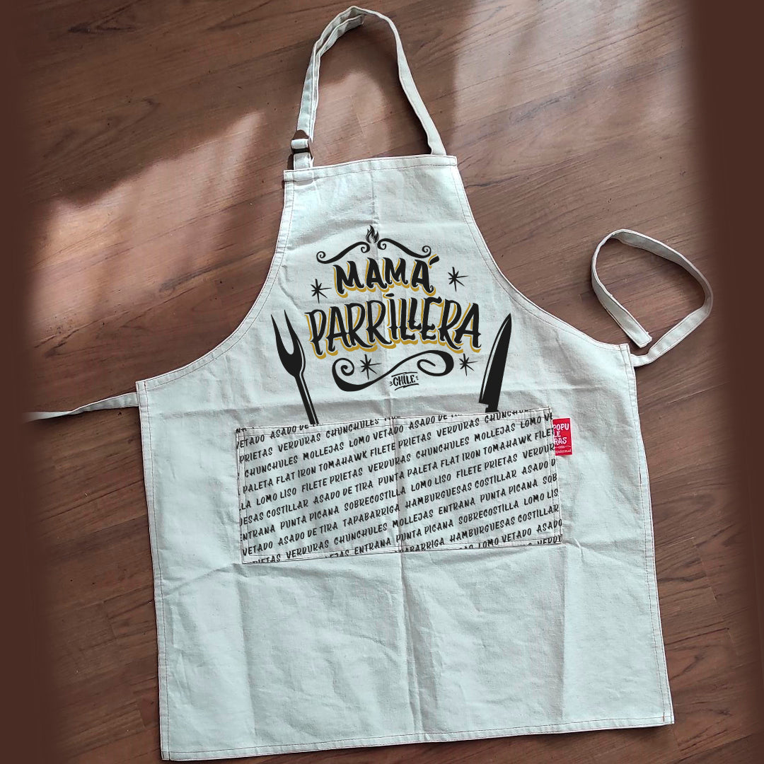 Pecheras de lona cruda con diseños especiales para ellas, ideales para usar en casa. Gráfica inspirada en la identidad popular chilena.